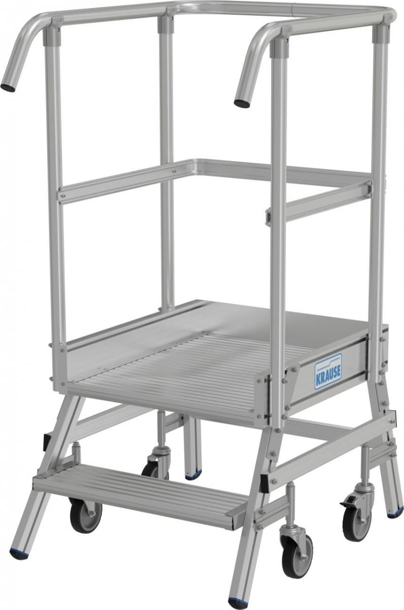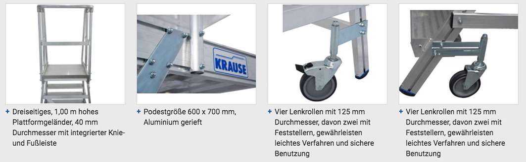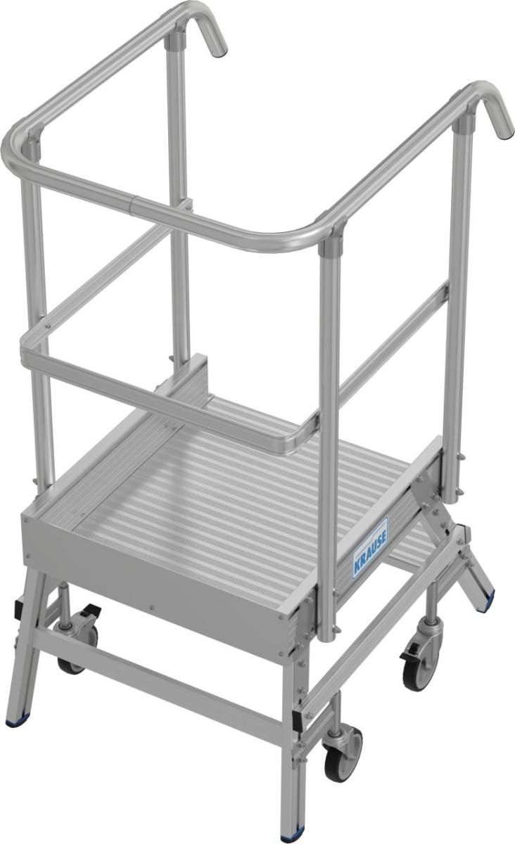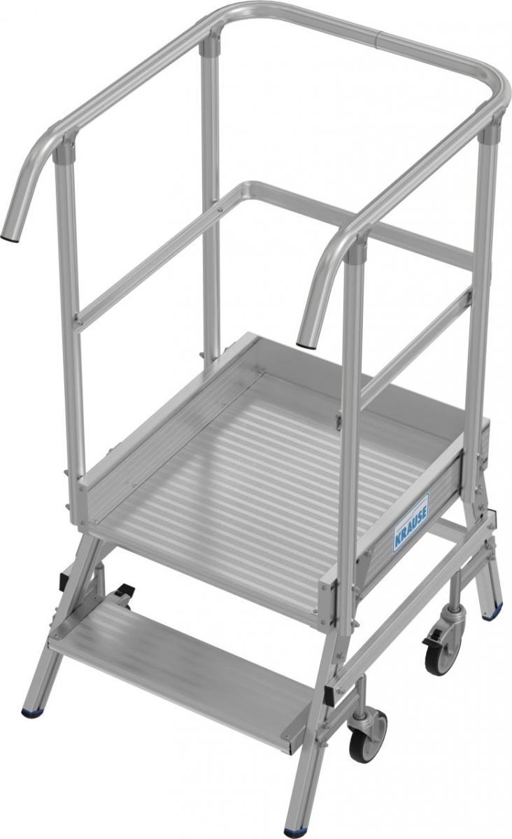 - Fahrbare Alu-Podestleiter, einseitig begehbar, mit 175 mm tiefen rutschhemmenden Stufen und grosser Standplattform incl. umlaufendem Plattformgeländer für sicheres und bequemes Arbeiten